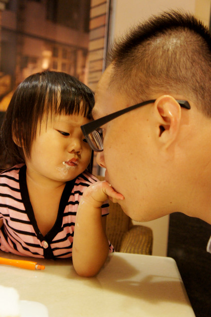 這就是傳說中的好吃千層派! 我不愛吃甜點,但潼潼和少女心應該是螞蟻投胎,他們兩個搶食的畫面就可以知道,潼潼還不分給他爸爸,她爸爸要吃都要再三詢問,潼心情好才會塞個一小口給少女心吃。我試了一口,真的很不錯,不會太乾也沒有非常甜,有些千層派很乾又死甜,